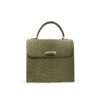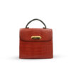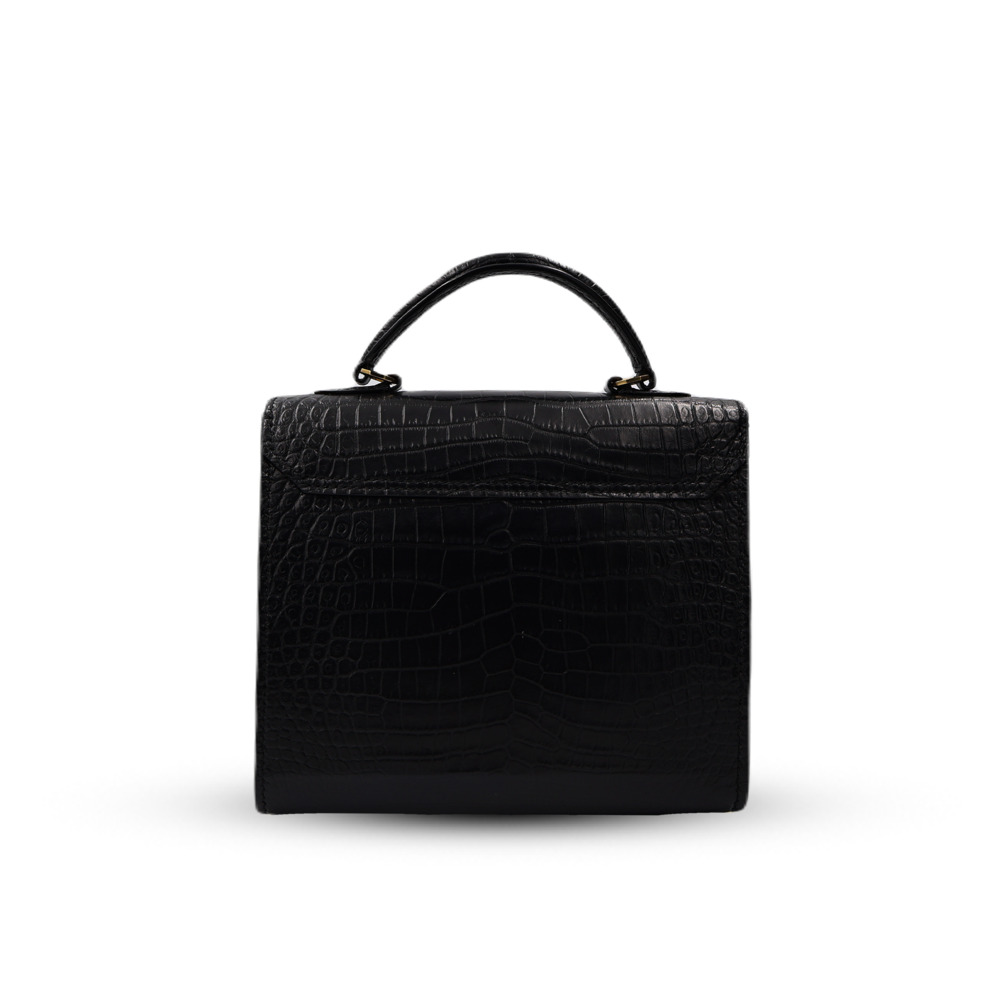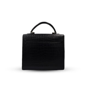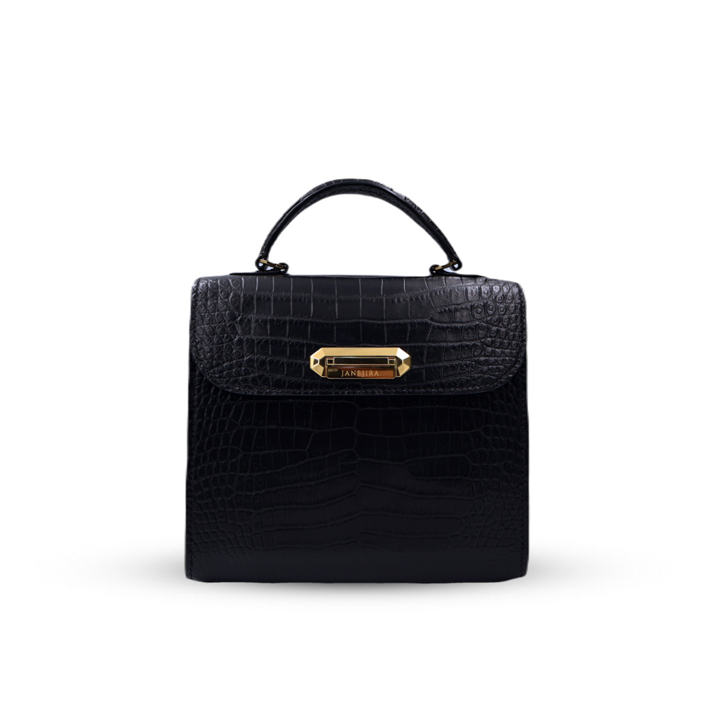 Crafted from premium crocodile leather, this handbag features a structured rectangular shape and a striking aurora purple hue. Its sleek and glossy finish, along with the distinctive crocodile skin texture, makes it a standout piece. The slightly curved top handle with gold hardware and the engraved “JANEJIRA” clasp add a touch of sophistication and elegance.