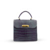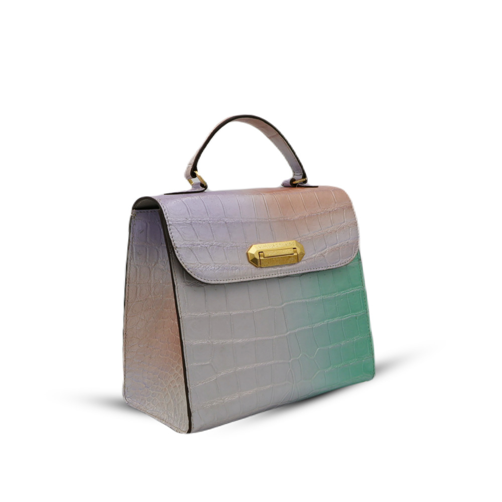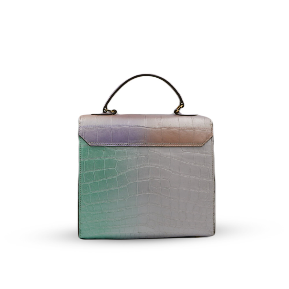 Crafted from premium crocodile leather, this handbag features a structured rectangular shape and a striking aurora purple hue. Its sleek and glossy finish, along with the distinctive crocodile skin texture, makes it a standout piece. The slightly curved top handle with gold hardware and the engraved “JANEJIRA” clasp add a touch of sophistication and elegance.